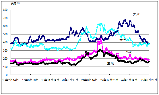 1.多种大宗农产品价格下跌。美国芝加哥商品交易所豆油、大豆和小麦最近期货合约收盘周均价每吨分别为1090美元、372美元和191美元,环比分别跌4%、3%和1%,同比分别高14%、低4%和低11%;国际棉花价格指数(SM级)每磅75.71美分(每吨1669美元),环比跌2%,同比低30%;国际糖料理事会原糖周均价每磅15.76美分(每吨347美元),环比跌2%,同比低30%;马来西亚棕榈油荷兰鹿特丹港到岸周均价每吨1345美元,环比跌1%,同比高11%;泰国100%B级和5%破碎率大米曼谷离岸周均价每吨分别为390美元和374美元,环比均跌1%,同比分别低34%和35%。